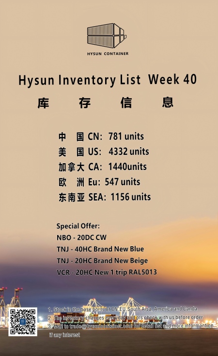 HYSUN has an inventory of CW and new dry containers at major ports in China, as well as in North America, Europe, and South Asia. They are ready to be picked up or rented.
