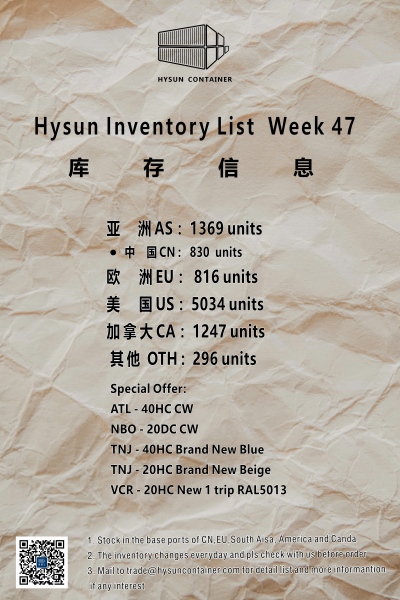 HYSUN has an inventory of CW and new dry containers at major ports in China, as well as in North America, Europe, and South Asia. They are ready to be picked up or rented.