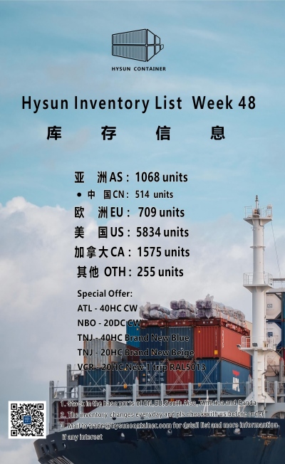 HYSUN has an inventory of CW and new dry containers at major ports in China, as well as in North America, Europe, and South Asia. They are ready to be picked up or rented.